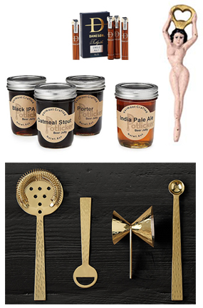 Bottom: Hammered Brass Bar Set: For the man who prefers things coordinated. Crafted from stainless steel and plated with polished brass. Set includes bottle opener, bar spoon, jigger and strainer. Jigger has stainless steel interior. $107.00