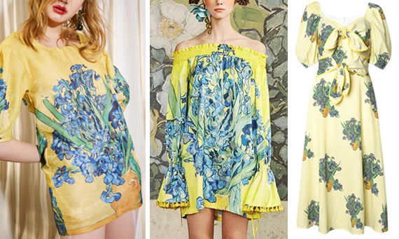 Right: Vintage Inspired Iris Dress– Yellow and white stripes with Van Gogh iris print. Puff sleeves. Double bows at front. Feminine. Grounded. Poly/cotton $219.00