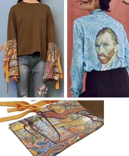 Right: Van Gogh self portrait on an apt wave pattern. Front of shirt has no image. Silky polyester. Inside is white. $98.00