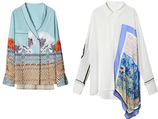 Left: Japanese Wave– Inspired Shirt- Makes a simple bottom look polished. Polyester. $139.00