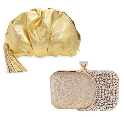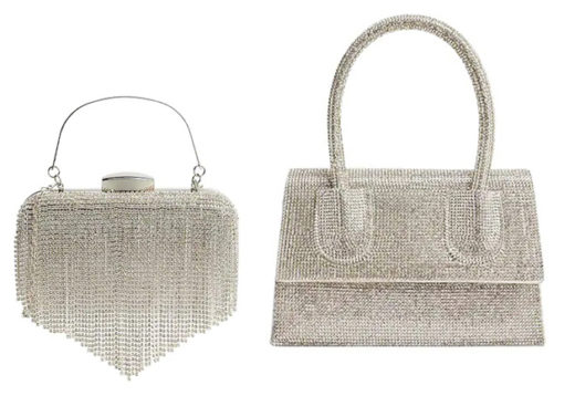 Right: Crystal Minaudiere: Also in silver. Removable crossbody strap Top clasp closure 8 in x 4.5 in. x 2in Sale $71.20