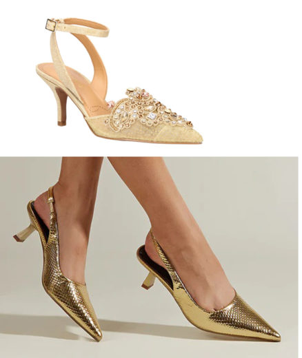 Butterfly Decorated High Heels: About 4 ½ “. Ankle strap. In gold or silver. $69.00!