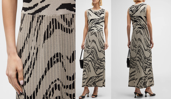 Opening: Misook Pleated Knit Maxi Dress with Zebra Intarsia: Wrinkle, fade, and stretch-resistant fabric holds its color and shape Approx. 52″L from shoulder to hem Crew neckline Sleeveless Ankle length Slipover style Rayon/polyester Unlined Rayon/polyester Machine wash $328.00