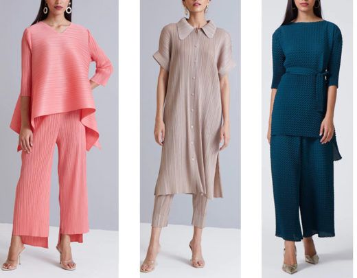 Erin Set: a V neck top, 3/4 sleeves, and asymmetric waterfall hemline on both sides, paired with gently flared pants with a hi-low hem. Innovative 3D pleating technique on a lightweight fabric paired with same fabric vertical pleated pants. Crumple up and wear. Due to texturing ensemble does not cling or accentuate body parts. Polyester $220.00