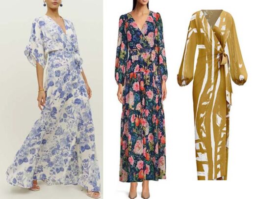 Floral Print V-Neck Faux Wrap Long Sleeve Maxi Dress by Eliza J:. V-neckline Fully lined polyester Center zip back closure Approx. 61″ length from shoulder to hemline $188.00