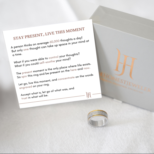 At first, it was honestly a distraction. I needed something to pull me out of my own thoughts, so I opened an Etsy shop and taught myself how to use a laser engraving machine. Over time, though, it became so much more than that. Creating spiritual, personalized jewelry turned into my lifeline. The spinner rings became tools for mindfulness—designed reminders to slow down, breathe, and be present. I realized that jewelry wasn’t just an accessory; it could be a vessel of comfort, intention, and healing. That transformation became the heart of The Honest Jeweler.