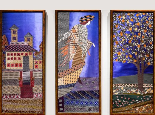 Artwork on right: Sally Shore, “Vienna 1897,” fiber collage.