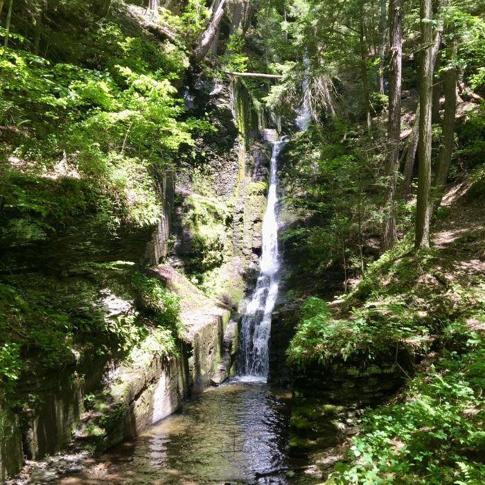 Dingmans Creek Trail, located off Route 209 in the Delaware Water Gap National Recreation Area, has generous parking and a visitor’s center that exhibits the nature of the area. There’s a boardwalk with no elevation that leads to two falls.