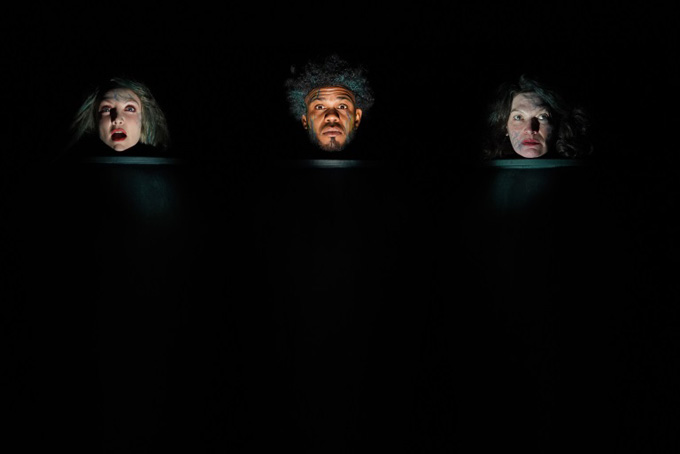 Play (1963 – then in German) finds a deceased man sandwiched between his mistress and wife. The trio’s heads extend out of funeral urns much like Nell and Nagg’s from garbage cans in Endgame. Each character is only concerned with her/himself, facing forward, oblivious of neighbors. Samuel Beckett: A Biography by Deirdre Blair, states Beckett wrote each part separately, then interspersed them, working out breaks.