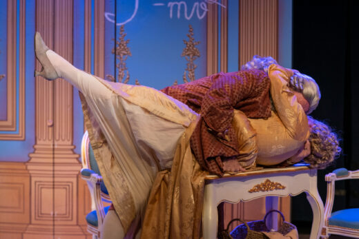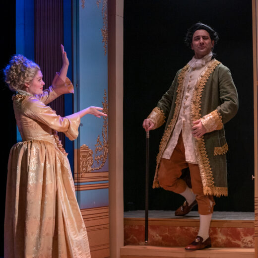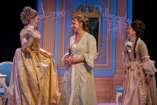 Erika Vetter shines in the genre. Her enthusiastic, wide-eyed persona, coltish physicality, and amusing sounds – giggles and at one point an operatic soprano orgasm – are delightful. Later, Vetter solidly enacts La Marquise’s daughter Gabrielle in a serious confrontation about the latter’s future. This in turn reflects strong words that passed between Émilie and her mother, an excellent Bonnie Black.