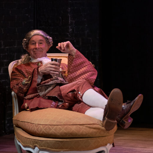 Nigel Gore is a find, utterly delicious in the role of Voltaire. Mercurial in his character’s approach, every tack he takes feels authentic. Cupidity, mischief, appreciation, stubbornness, imagination, and calculation all seem of a piece to the actor’s portrayal. He’s charmingly theatrical when Voltaire wants something and adamant when in competition.