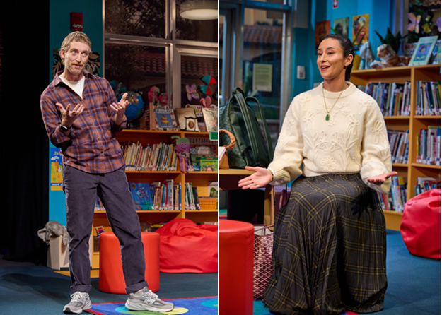 Todd Rosenthal’s colorful, contemporary school library – peppered with inclusion reminders – physically manifests Eureka’s philosophy of positivism. Clint Ramos has so effectively attired characters, we can imagine lifestyles.