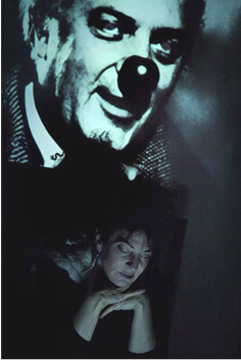 She opens her suitcase, which lights up from within. We hear a recording of Fellini. This evocative conceit occurs intermittently throughout the play. The artist’s own, wise and/or amusing words add color. Well chosen excerpts from his films, including the iconic fountain scene out of La Dolce Vita, as well as clips that place Metrikin in her fantasy, serve to heighten immersion. Imitation of on-screen characters is extremely sympathetic. Subtly introduced memories of Africa, conversations with her mother referring to grisly social upheaval, and a brief scene in which she plays her mum in a Phyllis Diller fright-wig (a la Fellini), work wonderfully. One may leave geography but not history.