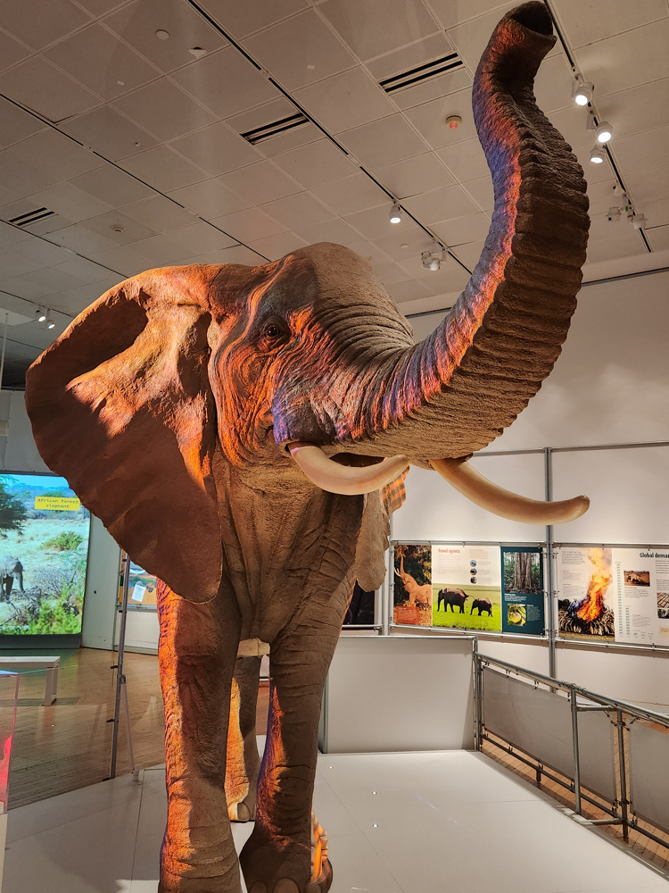 A “lift the flap” station quizzes guests with questions and answers which makes for a short but fun family guessing game. There’s a super–huge and very woolly mammoth with a touch-station for kids as they follow a possible path of the mammoth as it travelled the world about 17,000 years ago. The full-scale model of an African elephant features a projected and narrated peek into the goings-on inside the body, such as how food moves through its digestion system and how babies evolve during their 22-month gestation. Kids can create their own elephant herds by placing magnetic elephants on the wall-size magnetic mural.