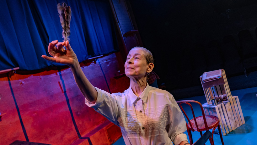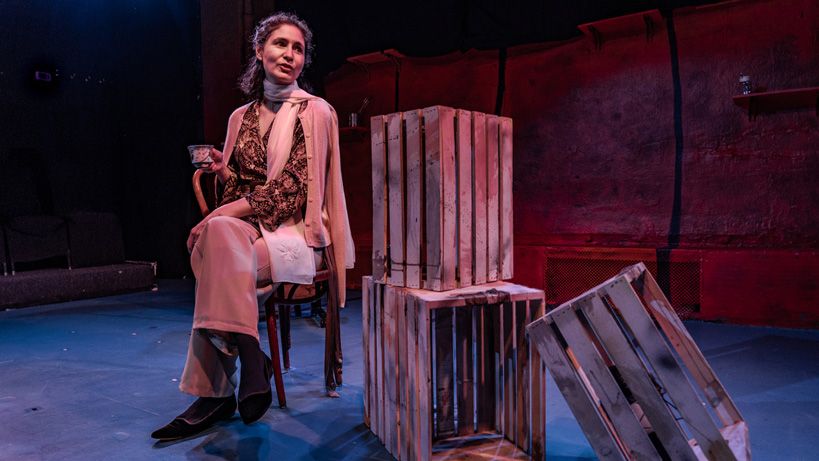 Rancher Mary Cabot Wheelwright (Haneen Arafat Murphy) ushers us into the scenario stating she knew both women. The narrator unobtrusively adds a bridge or two, stepping in as herself in brief parentheses. Georgia O’Keeffe (Gael Schaefer) was 52 and gender fluid when she met 19 year-old lesbian, Maria Chabot (Ria T. DiLullo). “They were both in love with Georgia O’Keeffe.” (At one point, Mary hired Maria to run her own ranch, though the younger woman persisted in taking care of what she perceived as Georgia’s needs.)