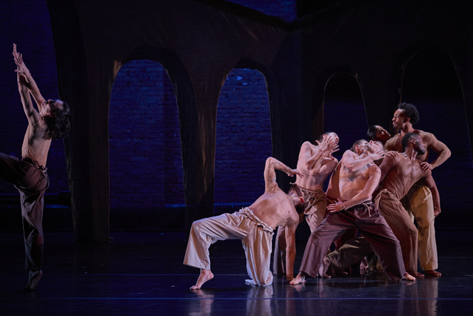 Arches of a ruin. Ominous music. Whispers. Dancers circle. One is outside. Arm over arm others unify. Limón choreography is full of circles. The Leader appears. Dancers bow and kneel, yet don’t let him in. Instead, he’s lifted, stepping forward onto palms and onto a back. The Outsider tries to get near him. He ends on the floor reaching, then fetal.