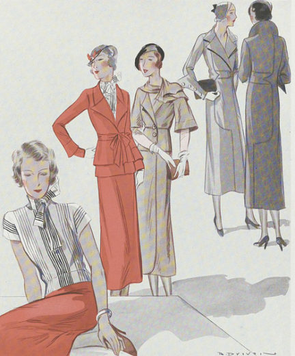 Column skirts – later flared just below the knee-and coordinating jackets combined to create women’s suits. These skimmed the body. Gores and narrow pleats created interest. Winter coats, and Hollywood gowns sported fur collars.