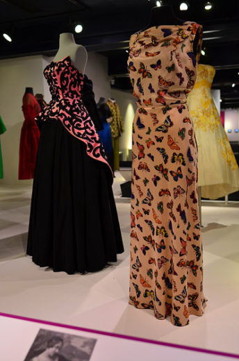 “Now we get to the two people best identified with elegance of the period, Fred Astaire and Ginger Rogers. It was fifty cents to see a double feature, an escapist opportunity to step into glamorous situations.” Rogers was dressed by Irene in 1937, but a great many of her later gowns were designed by favorite, Bernard Newman. Because films were black and white ensembles had to be over the top, evening wear sheer and shiny. “Newman had a real sense of how a dress moved. Beads can weigh 25-30 pounds. A beaded garment moves slowly even after a dance step is completed.”