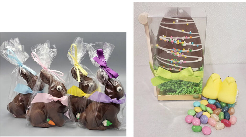 Right: SMASH EGG filled with Peep,Jelly Beans, and Easter M&M’s: Comes with its own hammer. 5 inch Milk Chocolate filled. Hollow Egg. $10.95
